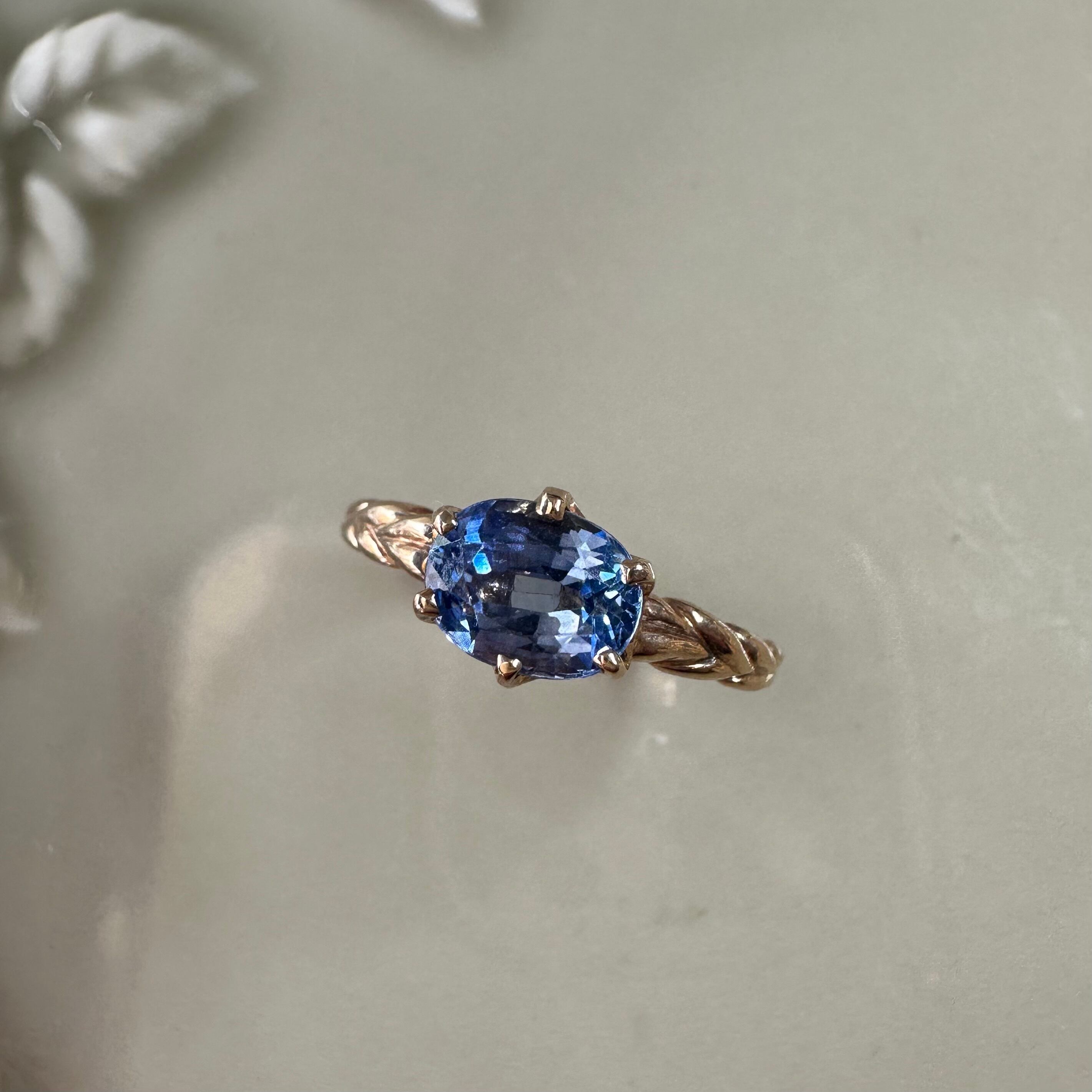 リーフモチーフのデザインが、女性らしさを引き立てます。ブルーサファイアは、真実の愛や守護とされ、幸せをもたらす石として人気を集めています。このリングは、大切な人への贈り物や特別な日の演出にもぴったりです。